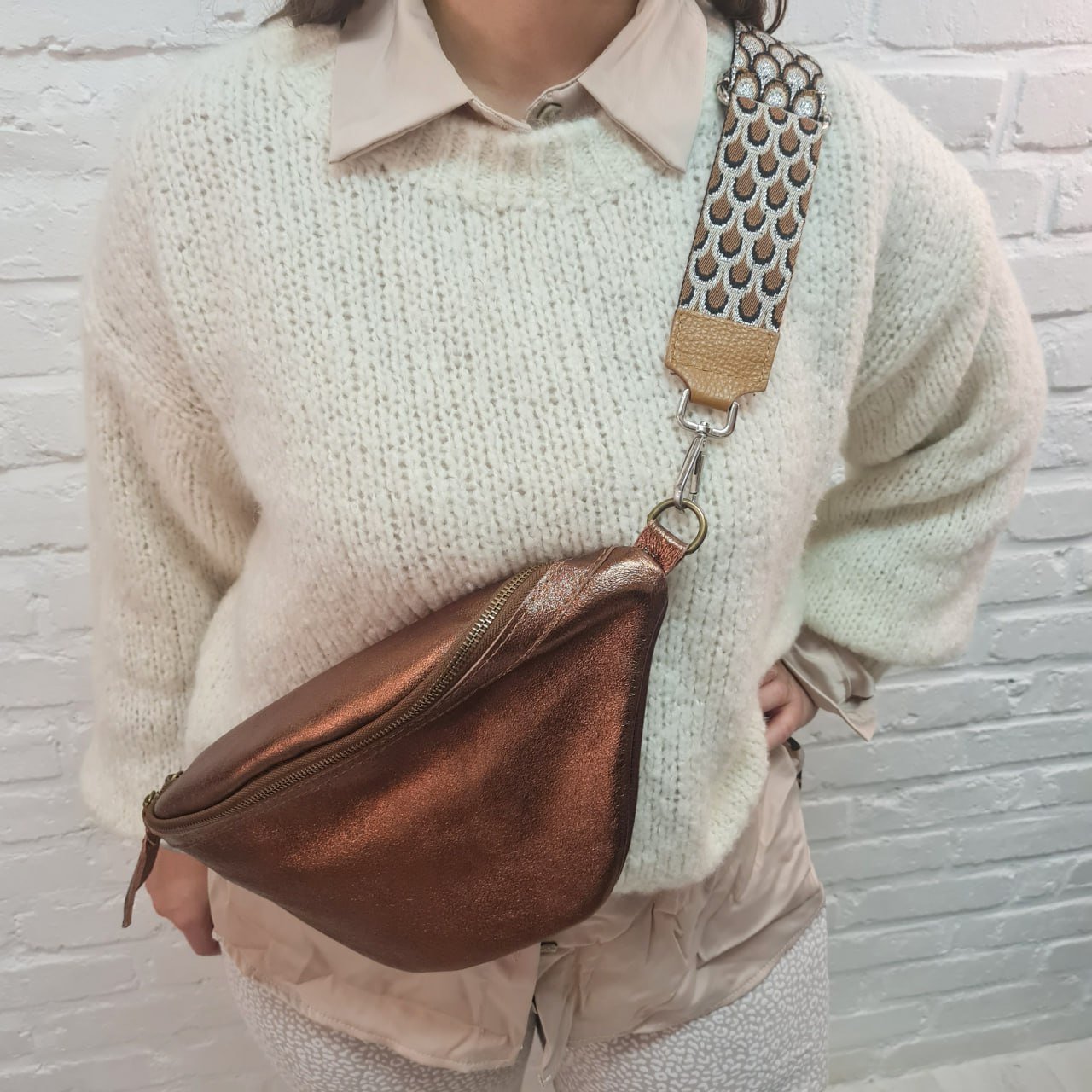 Pour ajouter une touche de fun, nous suggérons d’associer une bandoulière large à motif à votre sac banane!