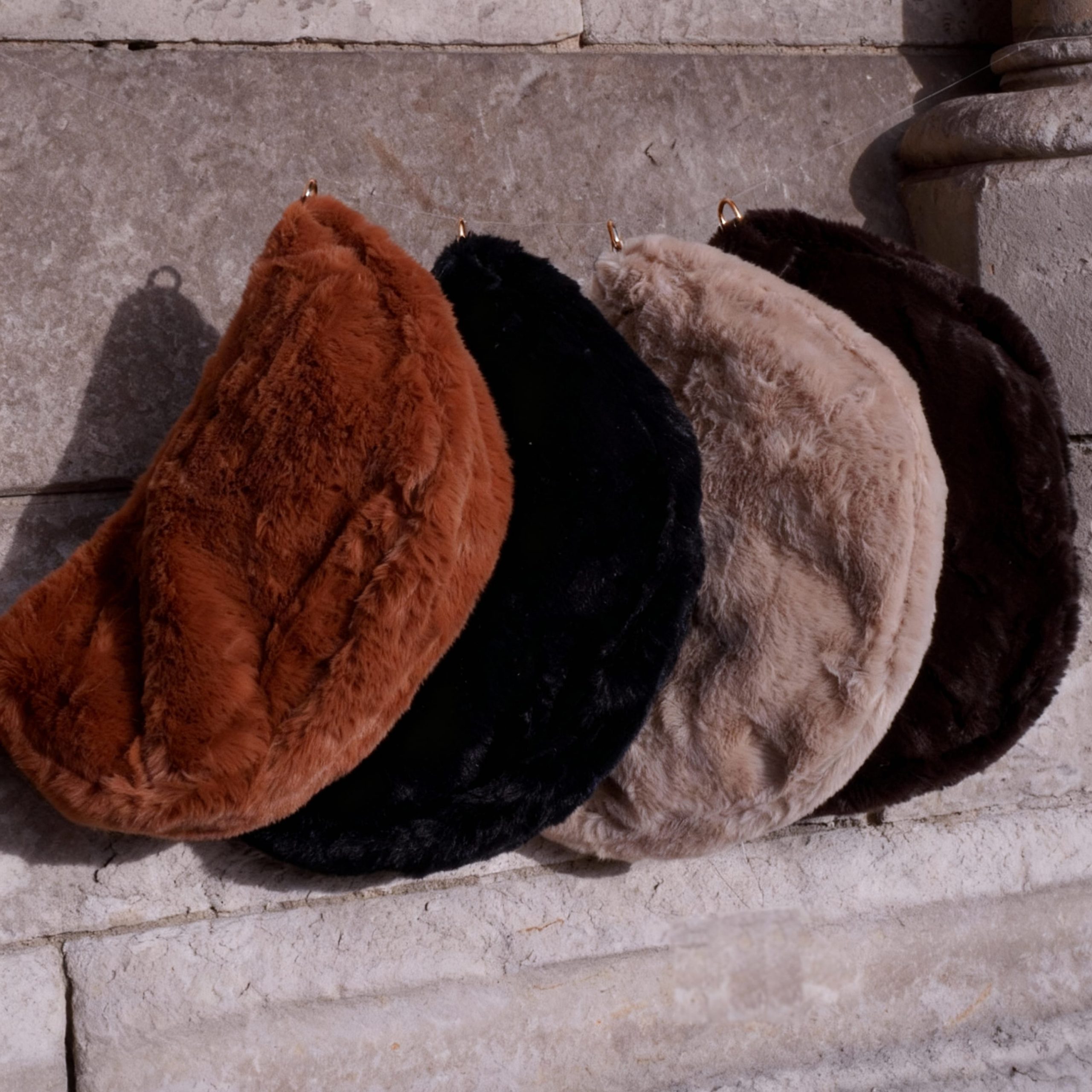 Les couleurs : marron, Camel, noir et beige, ces Bananes en fourrure aux tons chauds complètent parfaitement les looks hivernaux