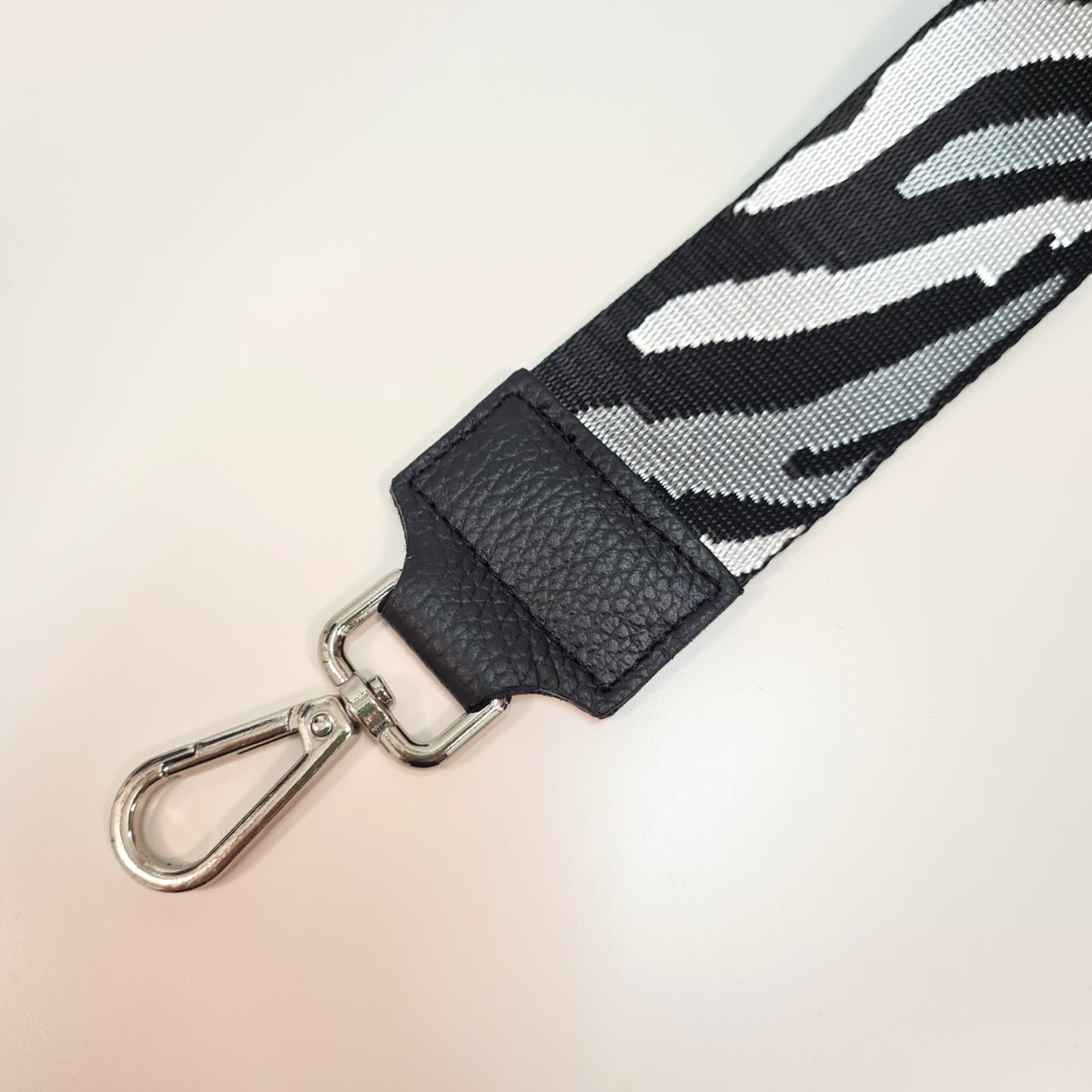 Cette bandoulière de sac à main avec ses tons noir blanc et argenté et ses mousquetons argentés apportera un style habillé à votre look.