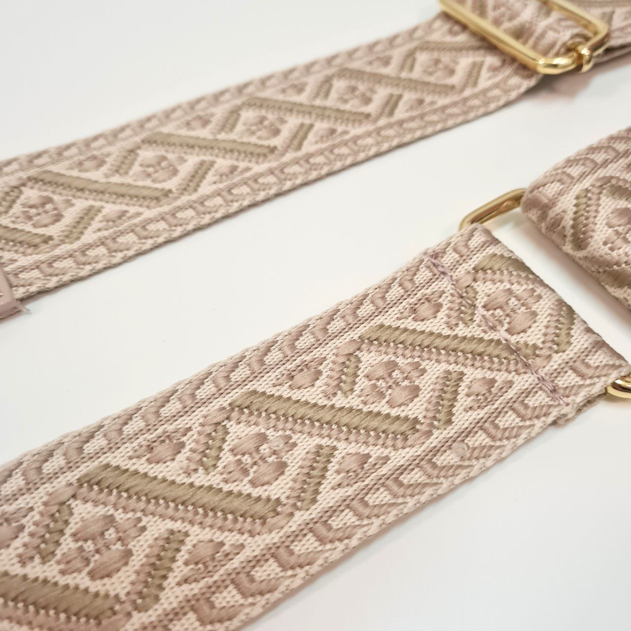 Cette bandoulière de sac à main avec ses tons rose poudre, beige et ses mousquetons dorés apportera un style habillé à votre look.
