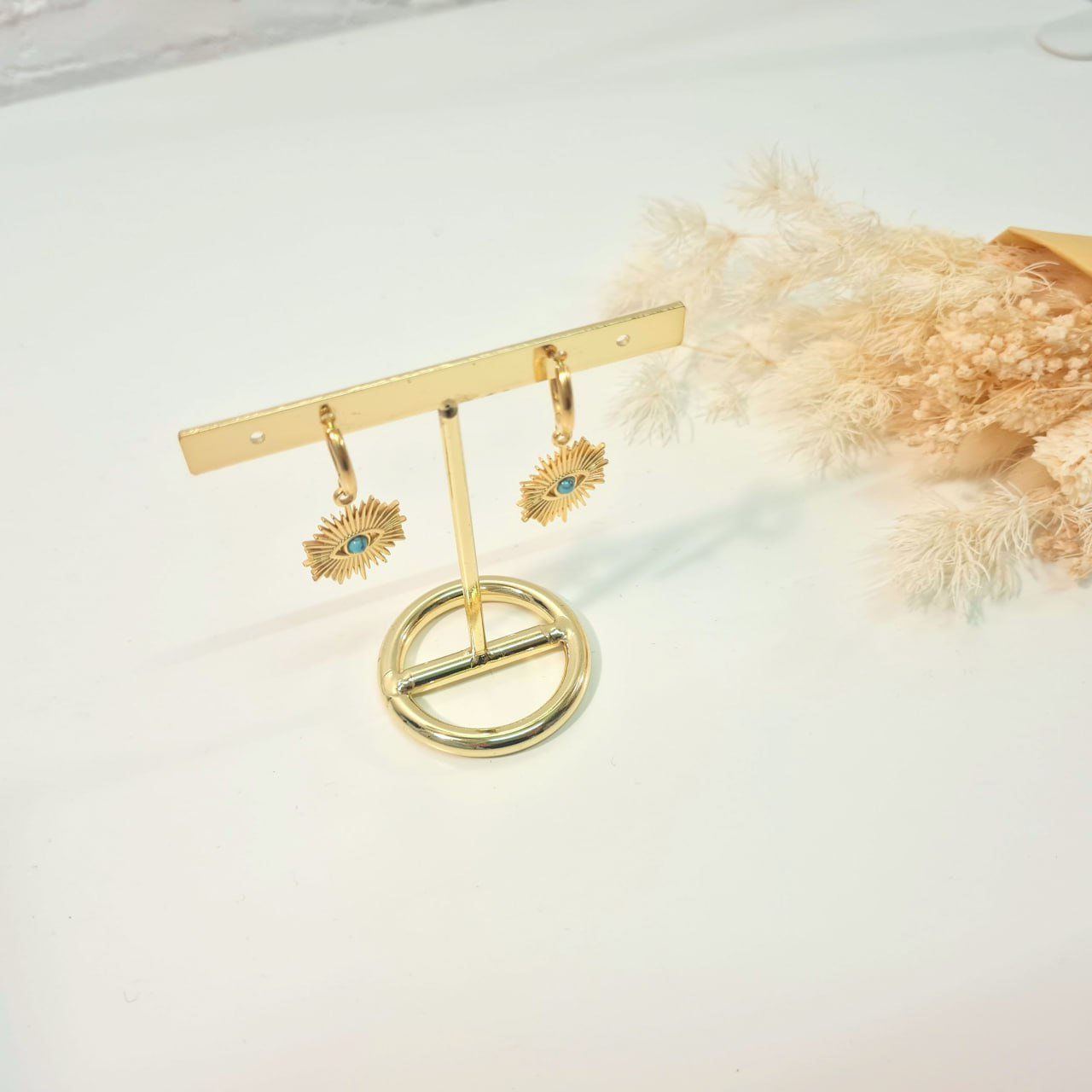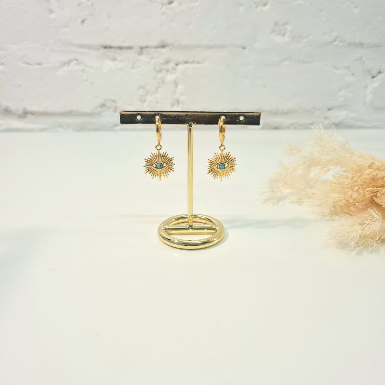 La paire de boucles d’oreilles EYES ON YOU en acier inoxydable doré et bleu est parfaite pour l’été! On aime son originalité !