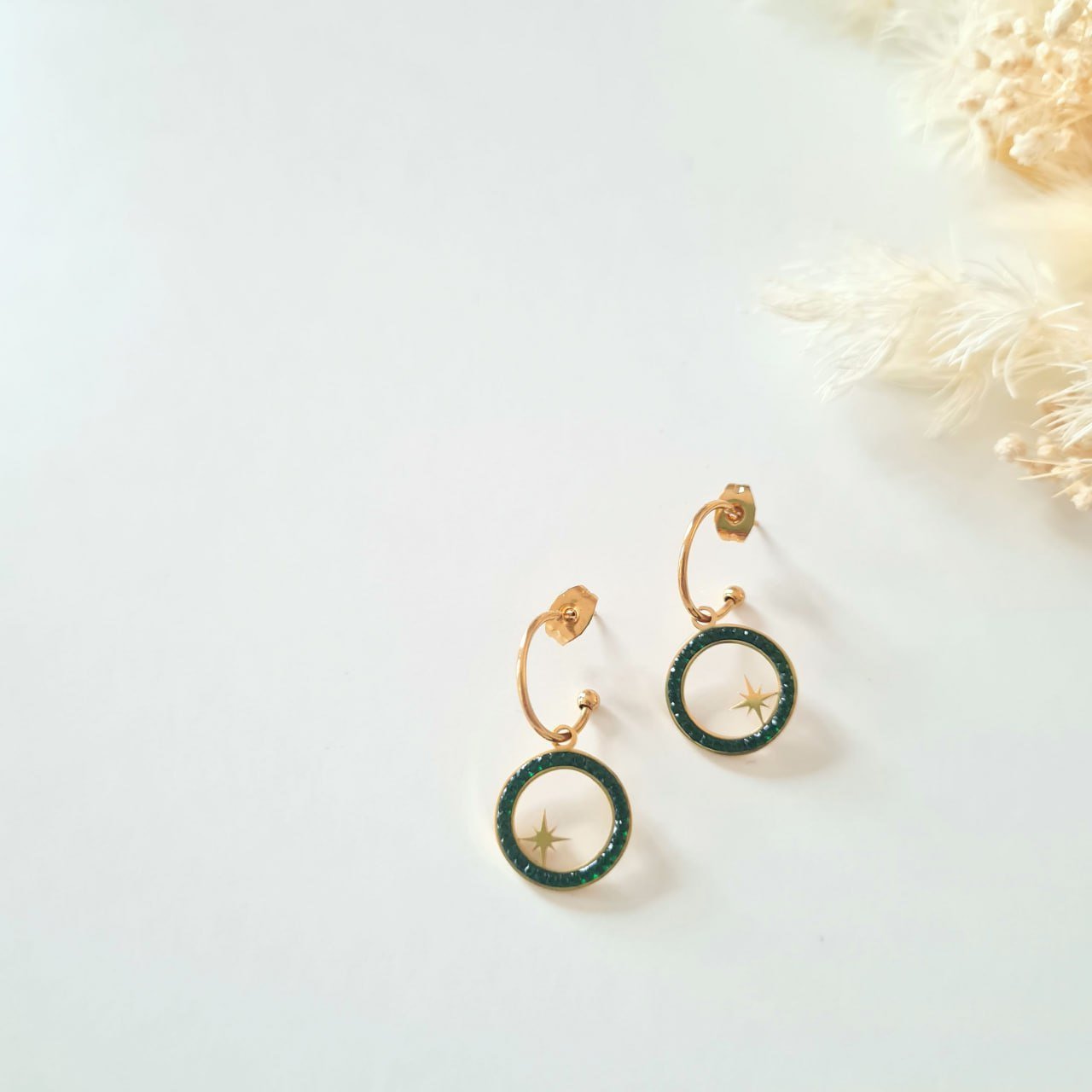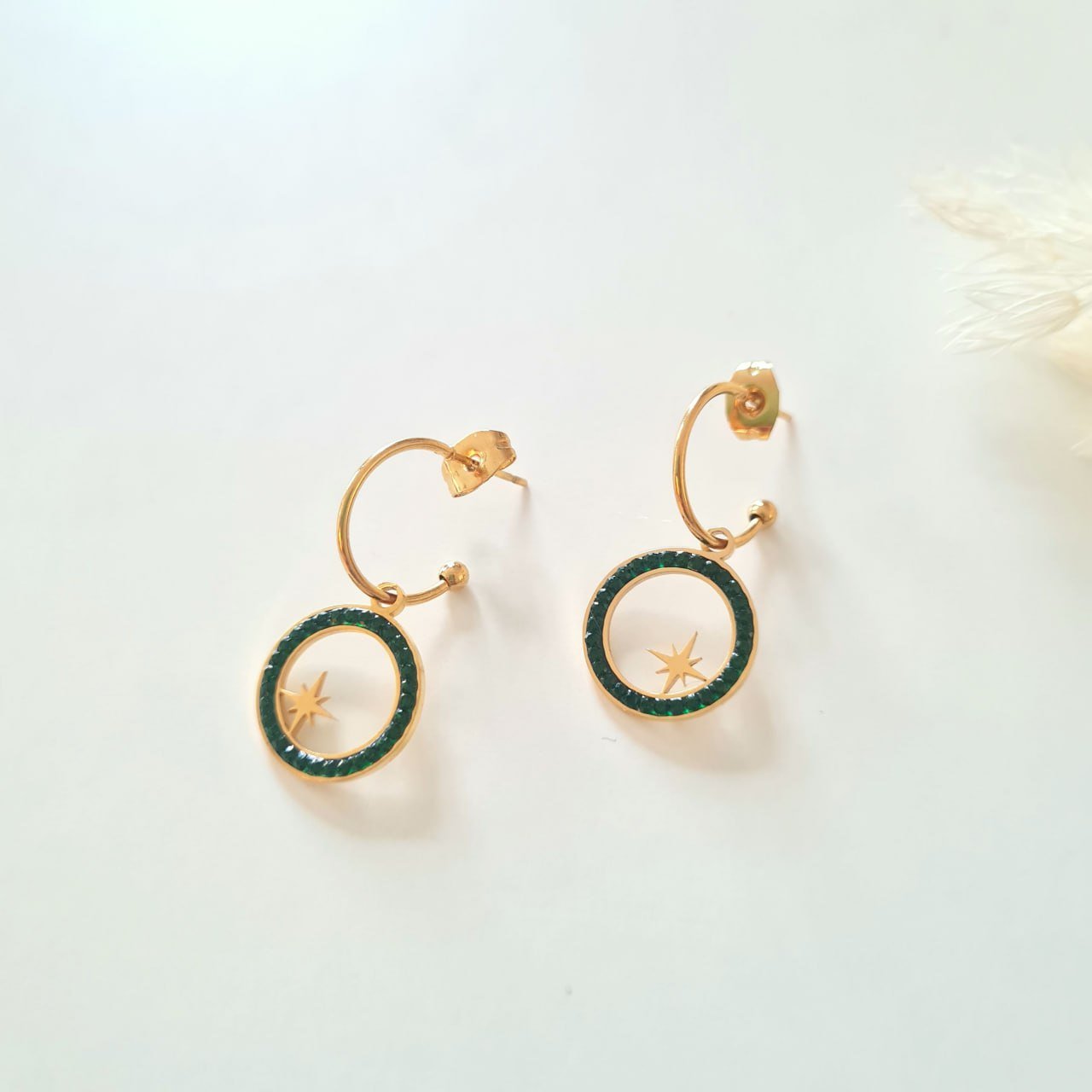 Modèle de boucles d’oreilles pendantes en acier inoxydable doré et détails verts.