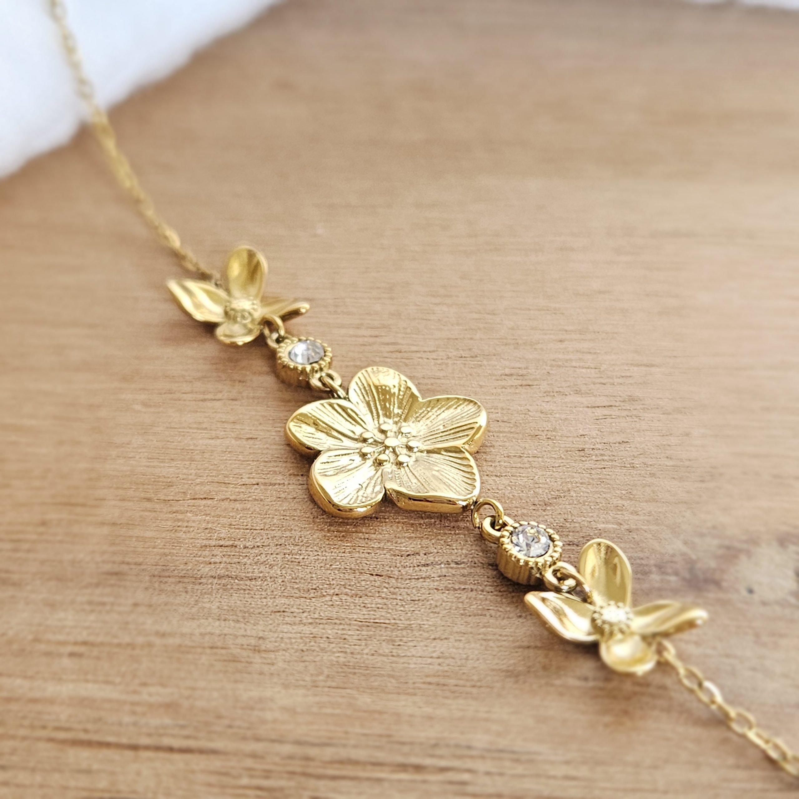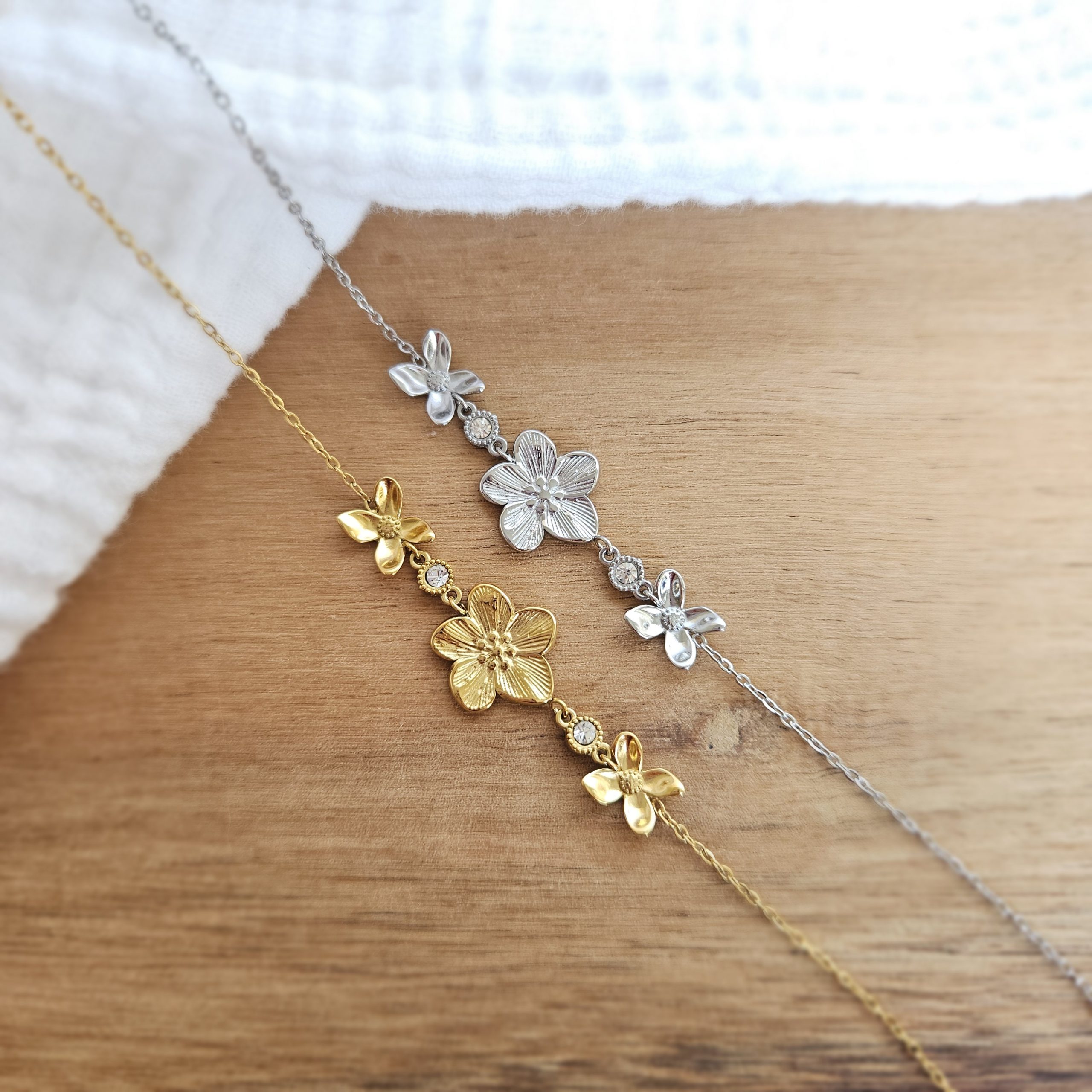 Découvrez ce bracelet fin et élégant orné de fleurs à strass, disponible en version dorée ou argentée pour s’adapter à tous vos looks.