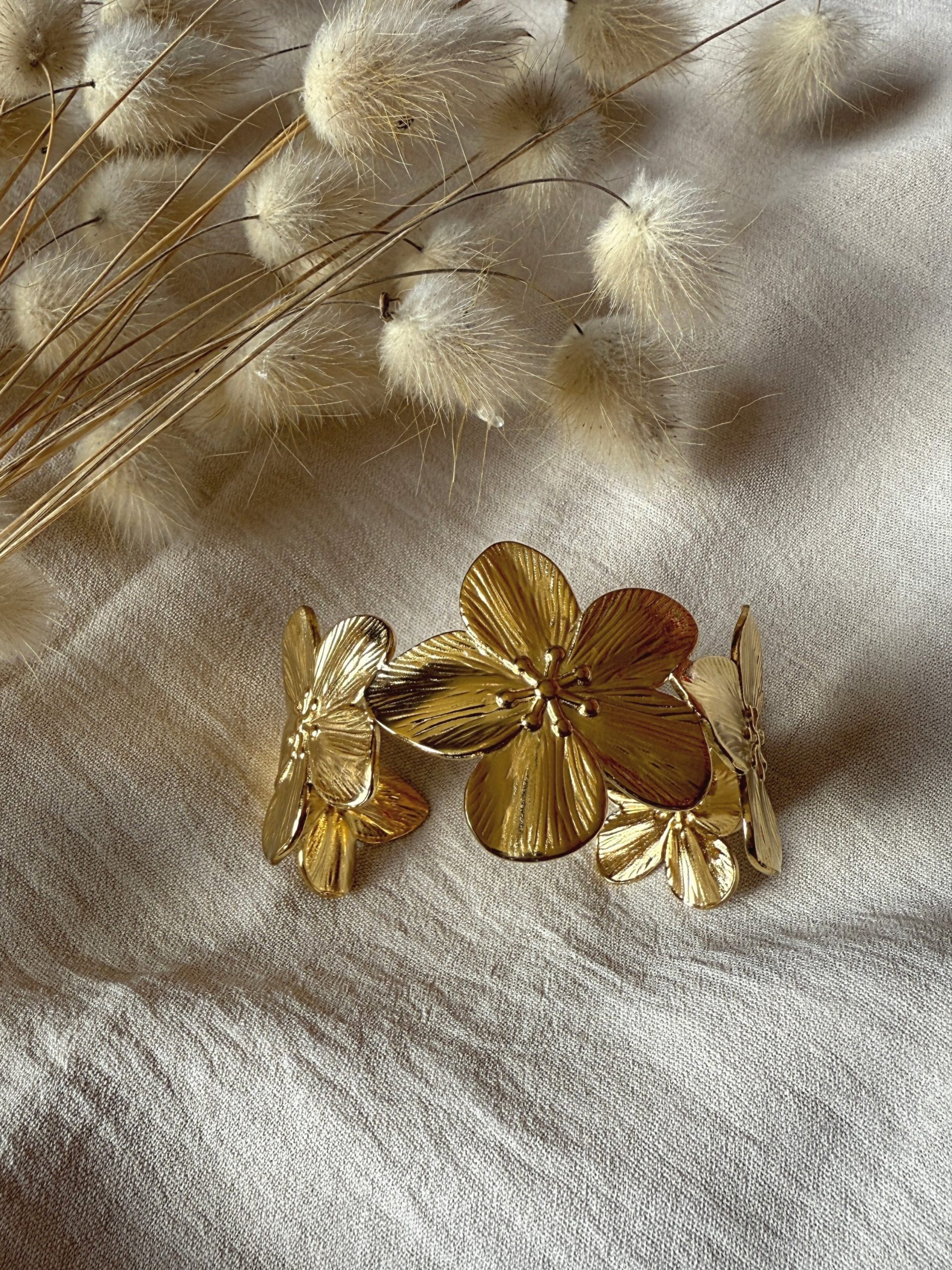 La bracelet manchette doré fleurs est un jonc rigide ajustable. Vous pourrez parfaitement l’adapter à votre poignet !