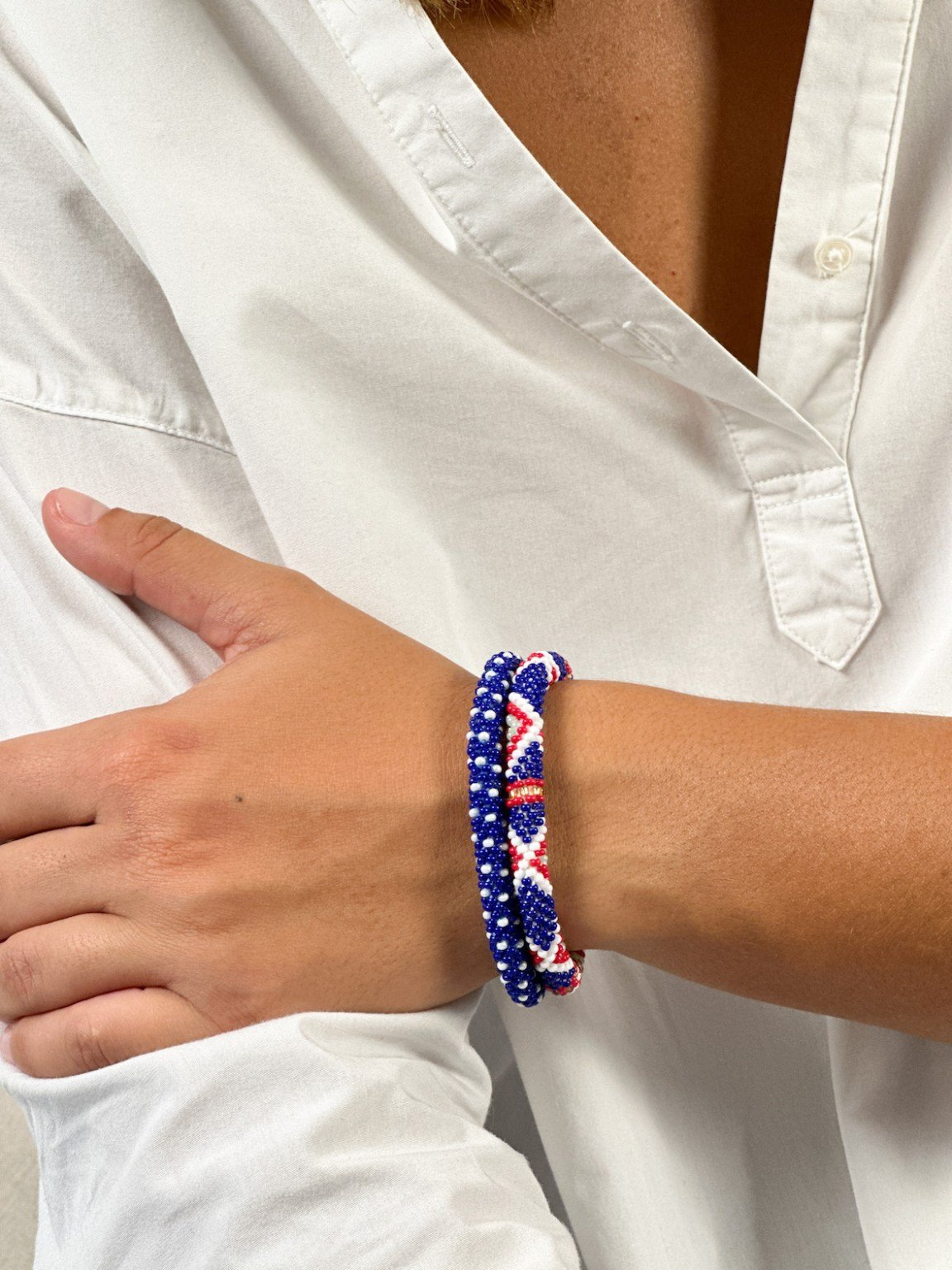 Les femmes népalaises avec lesquelles nous travaillons sont indépendantes et fabriquent les bracelets sur leur temps libre, dans leur village près de Katmandou. Avec une grande dextérité, les créatrices enfilent les perles de verre sur un fil résistant, créant souvent des motifs spécifiques.