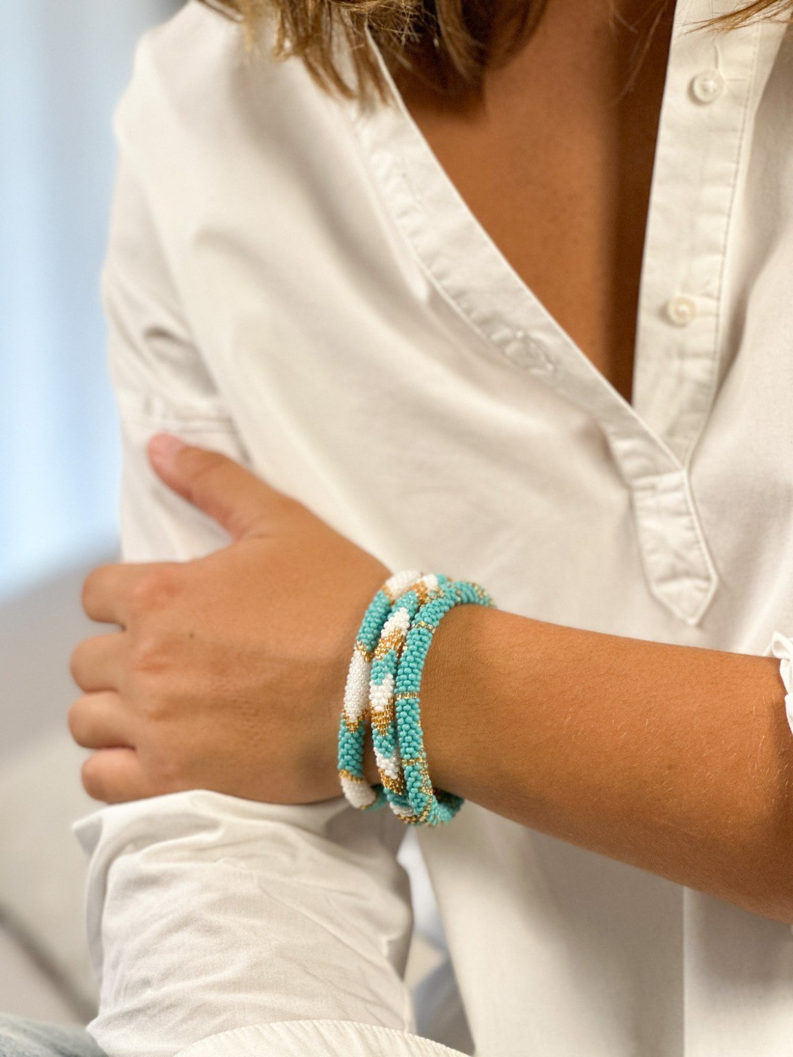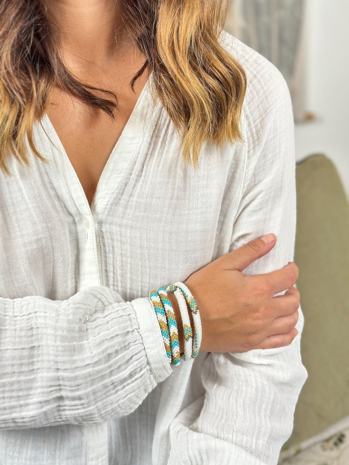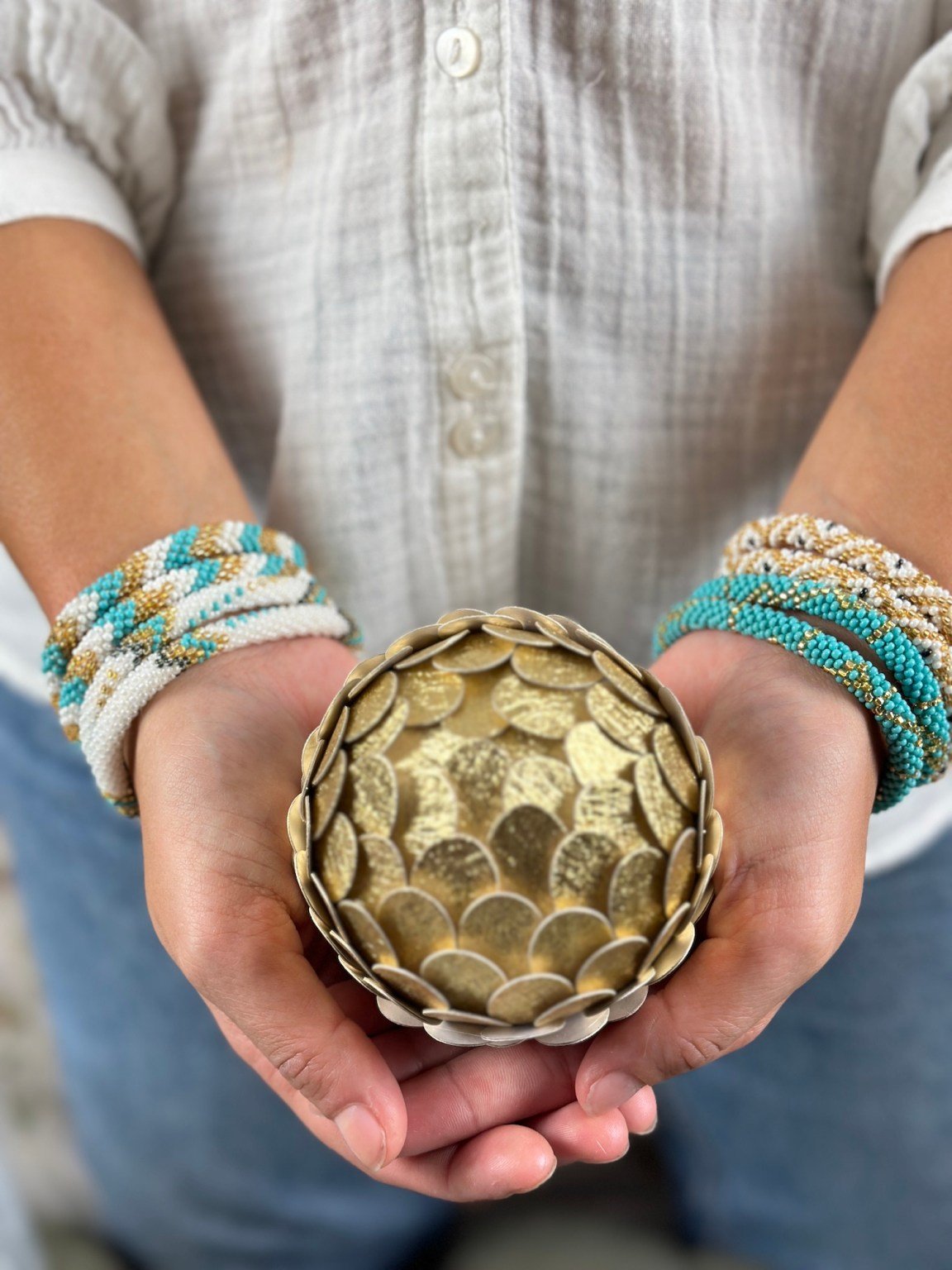 Les femmes népalaises avec lesquelles nous travaillons sont indépendantes et fabriquent les bracelets sur leur temps libre, dans leur village près de Katmandou. Avec une grande dextérité, les créatrices enfilent les perles de verre sur un fil résistant, créant souvent des motifs spécifiques.