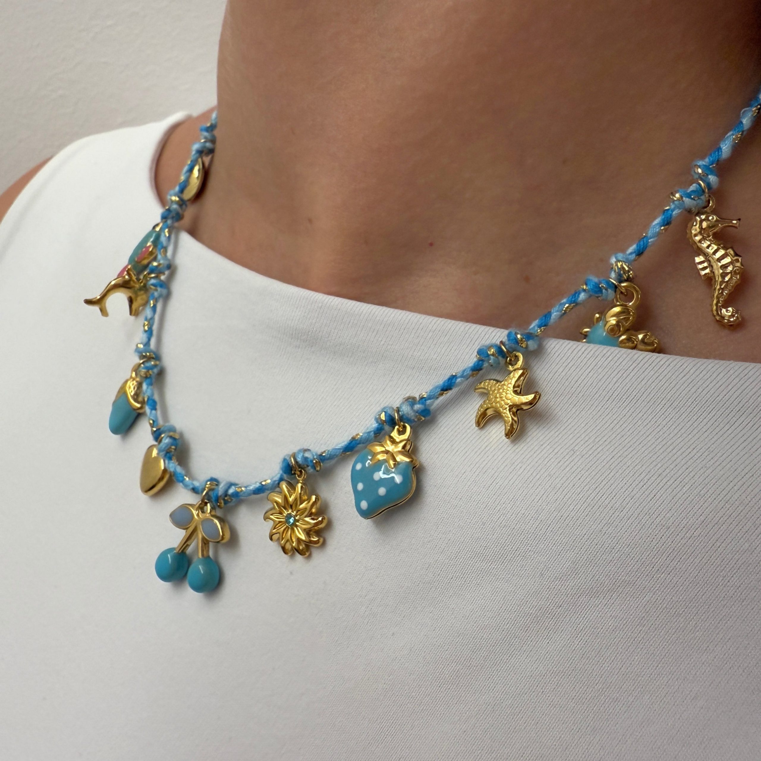Le collier cordon bleu et pampilles est parfait pour apporter une touche colorée à vos tenues.