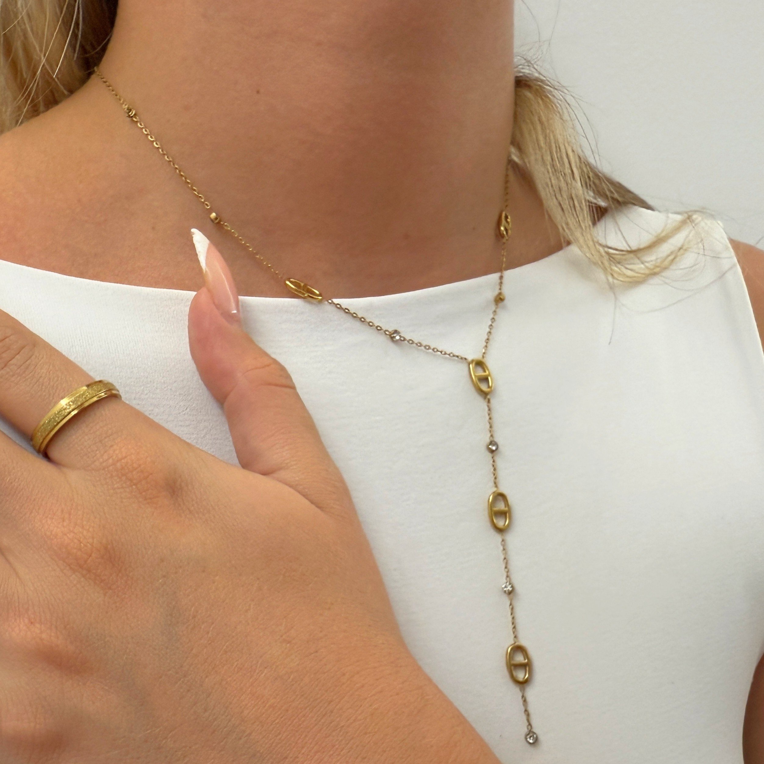 Le collier Y doré maille marine est entièrement en acier inoxydable, il est donc résistant à l’eau et ne se décolore pas.