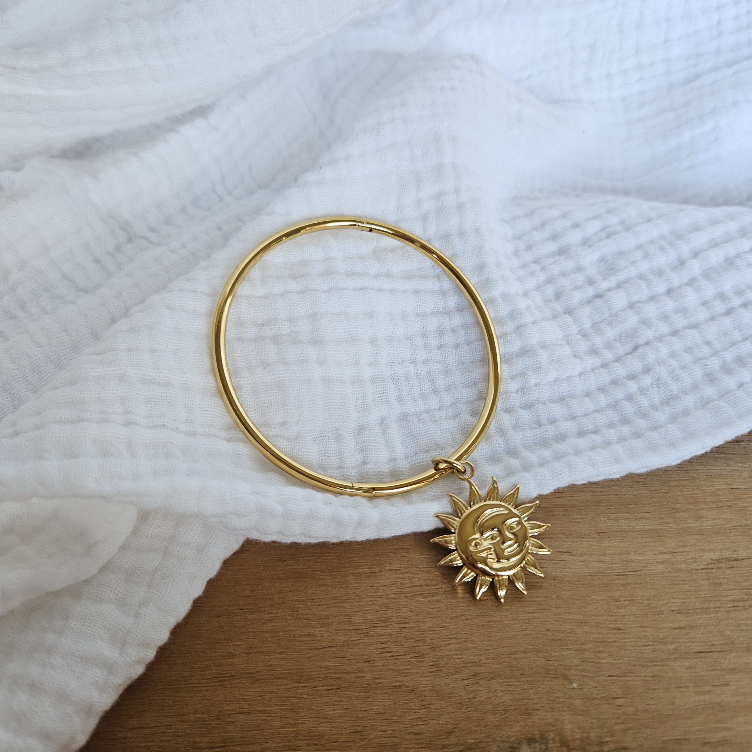 Ce bracelet rigide est orné d’un charm soleil détaillé qui apporte une touche bohème et chaleureuse à vos tenues. Son système d’ouverture permet de l’enfiler facilement au poignet tout en restant bien en place une fois fermé. Idéal porté seul pour un look épuré ou combiné avec d’autres joncs et bracelets pour un style superposé tendance.