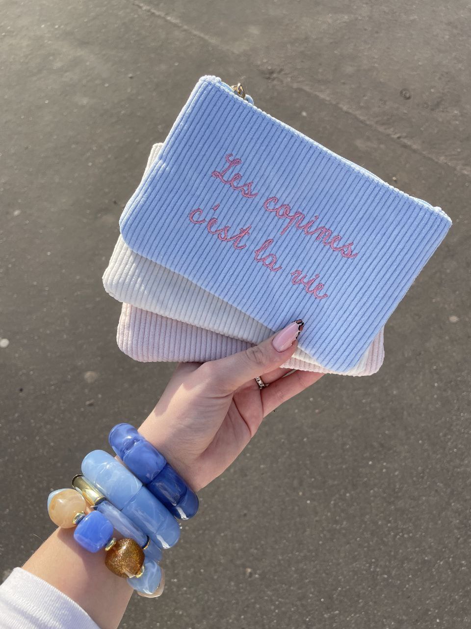 Pratiques et stylées, elles se ferment grâce à un zip et s’emportent partout pour ranger maquillage, bijoux ou petits essentiels du quotidien avec une touche de tendresse.