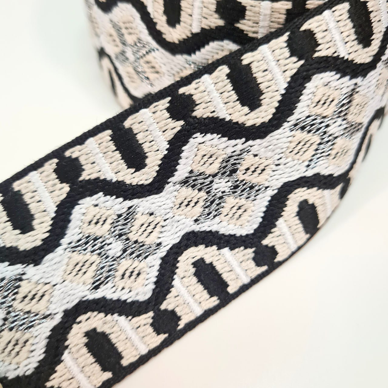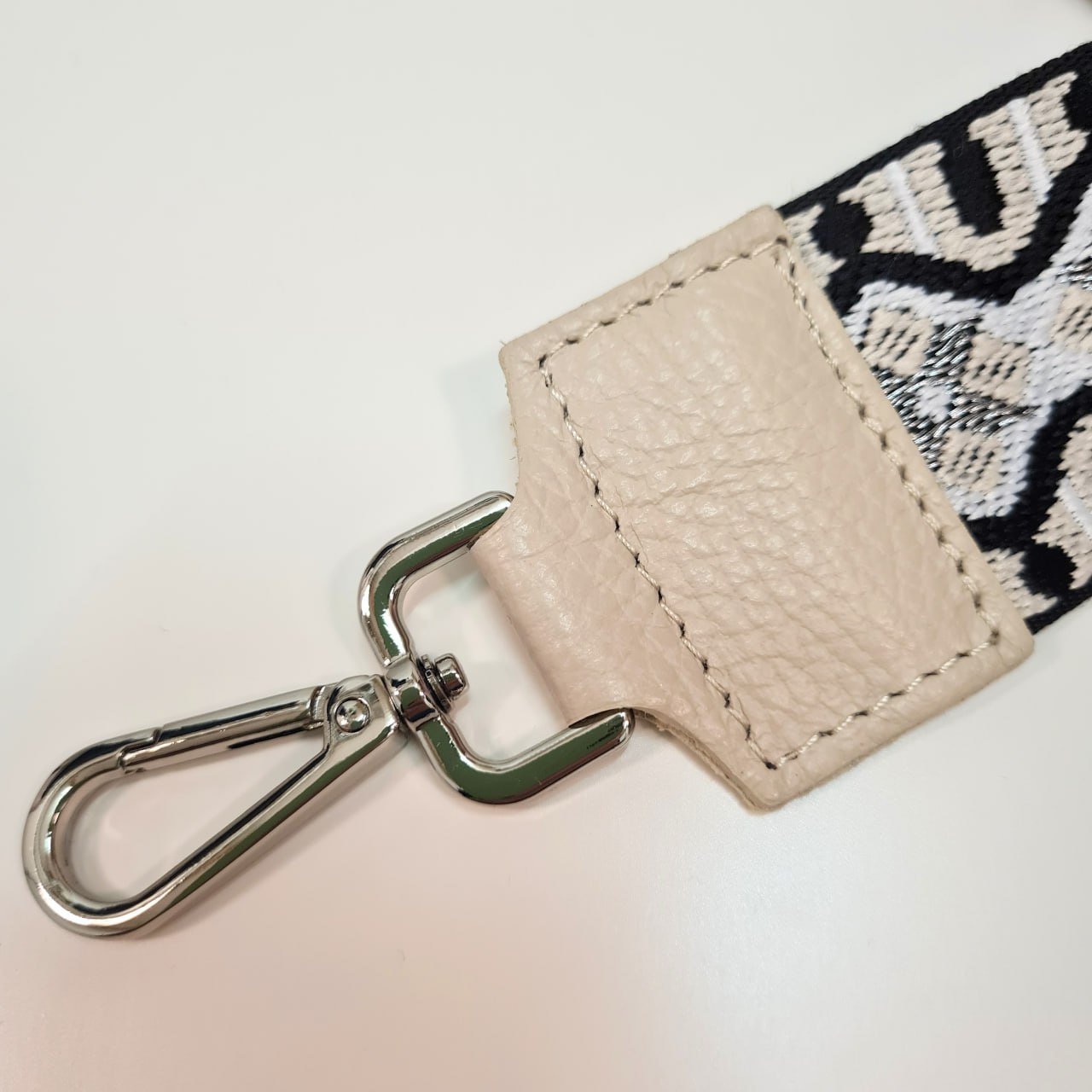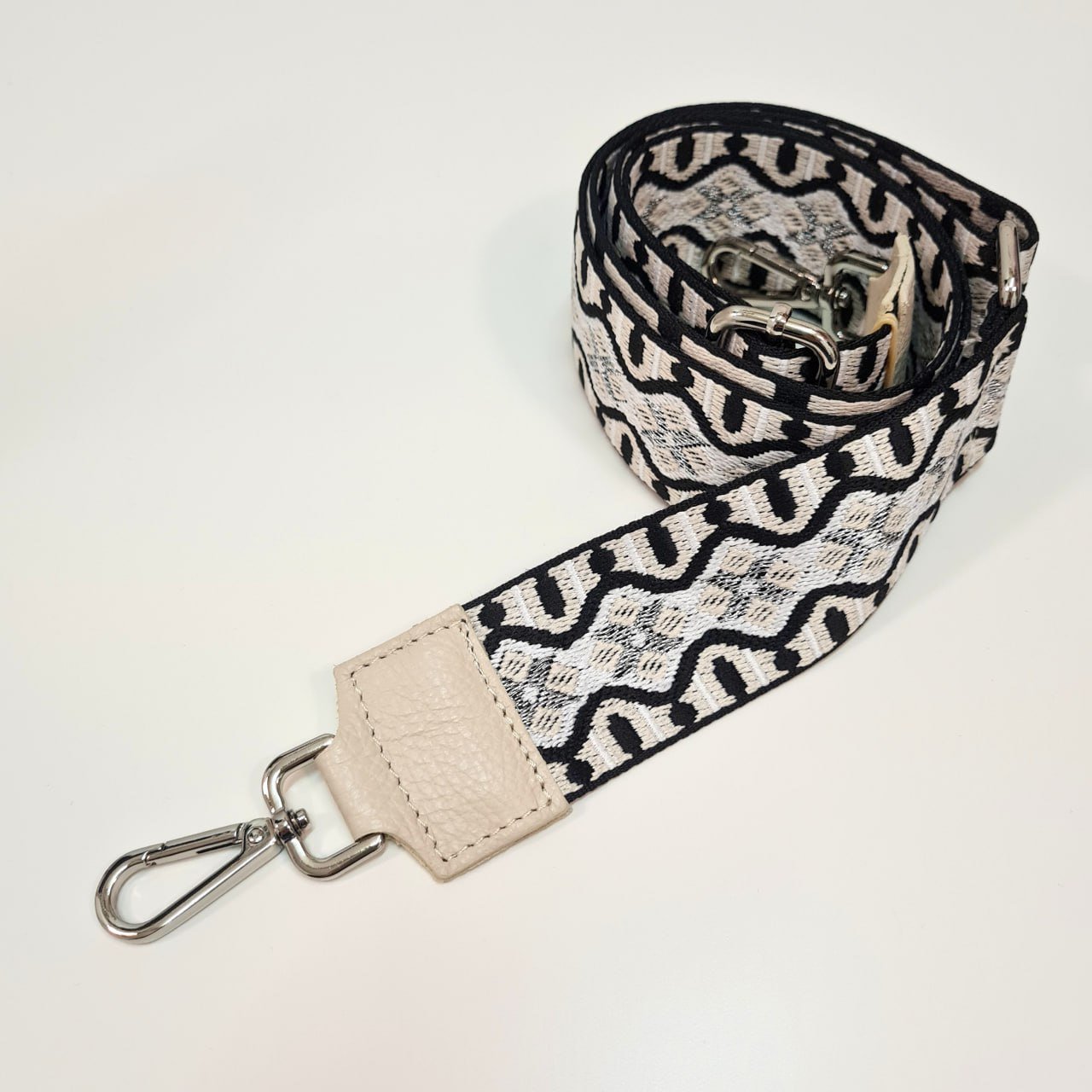 Cette bandoulière de sac à main noire, beige grise et blanche avec ses mousquetons argentés donnera un style rétro à votre tenue!