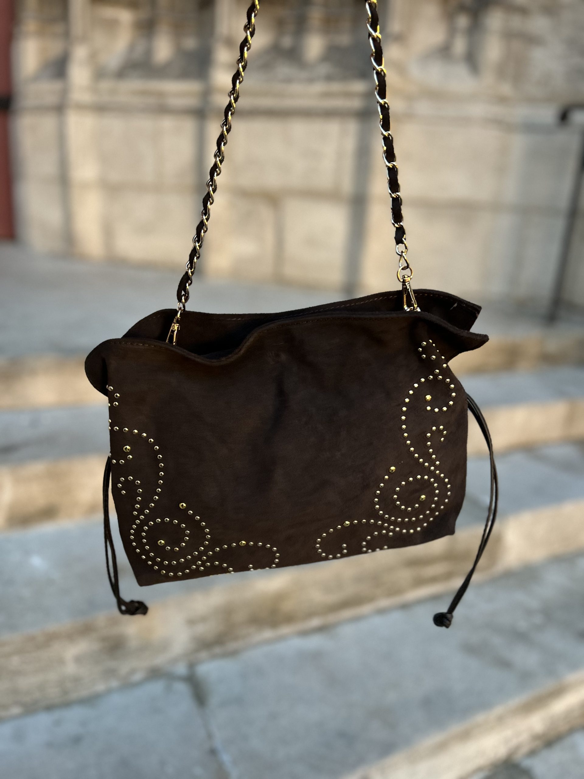 La chaînette apporte une touche plus sophistiquée et habillée au sac daim à clous. Ce mode de portage est parfait pour les sorties en soirée, les événements ou simplement lorsque vous voulez donner un caractère plus élégant à votre look. La chaînette, qu’elle soit dorée ou argentée, dialogue magnifiquement avec les clous métalliques pour créer une cohérence esthétique séduisante.