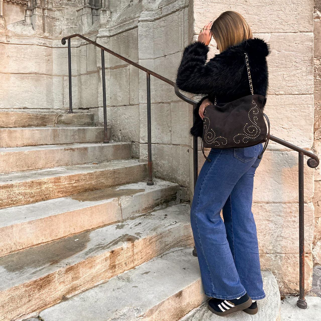 L’ajout de clous permet également au sac daim à clous de s’intégrer parfaitement dans différents univers stylistiques : du look rock authentique avec perfecto et bottines cloutées, au style bohème chic avec robe fluide et bijoux ethniques, en passant par le casual urbain avec jean brut et pull oversize.