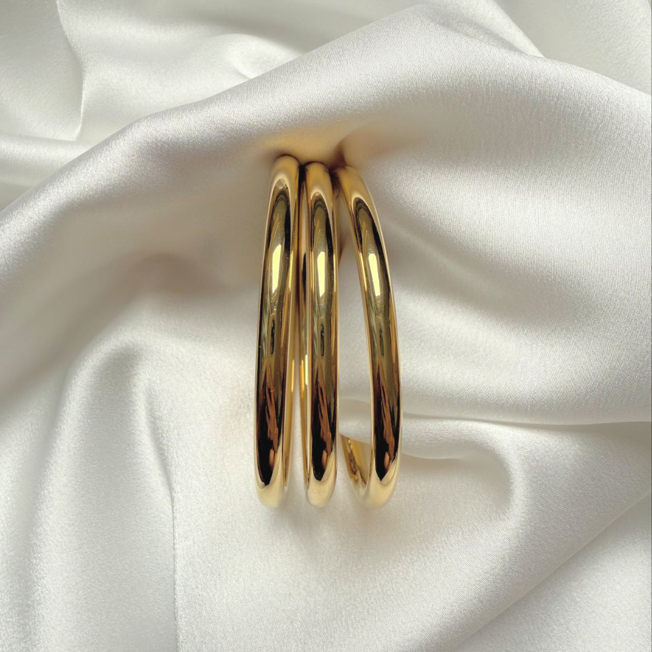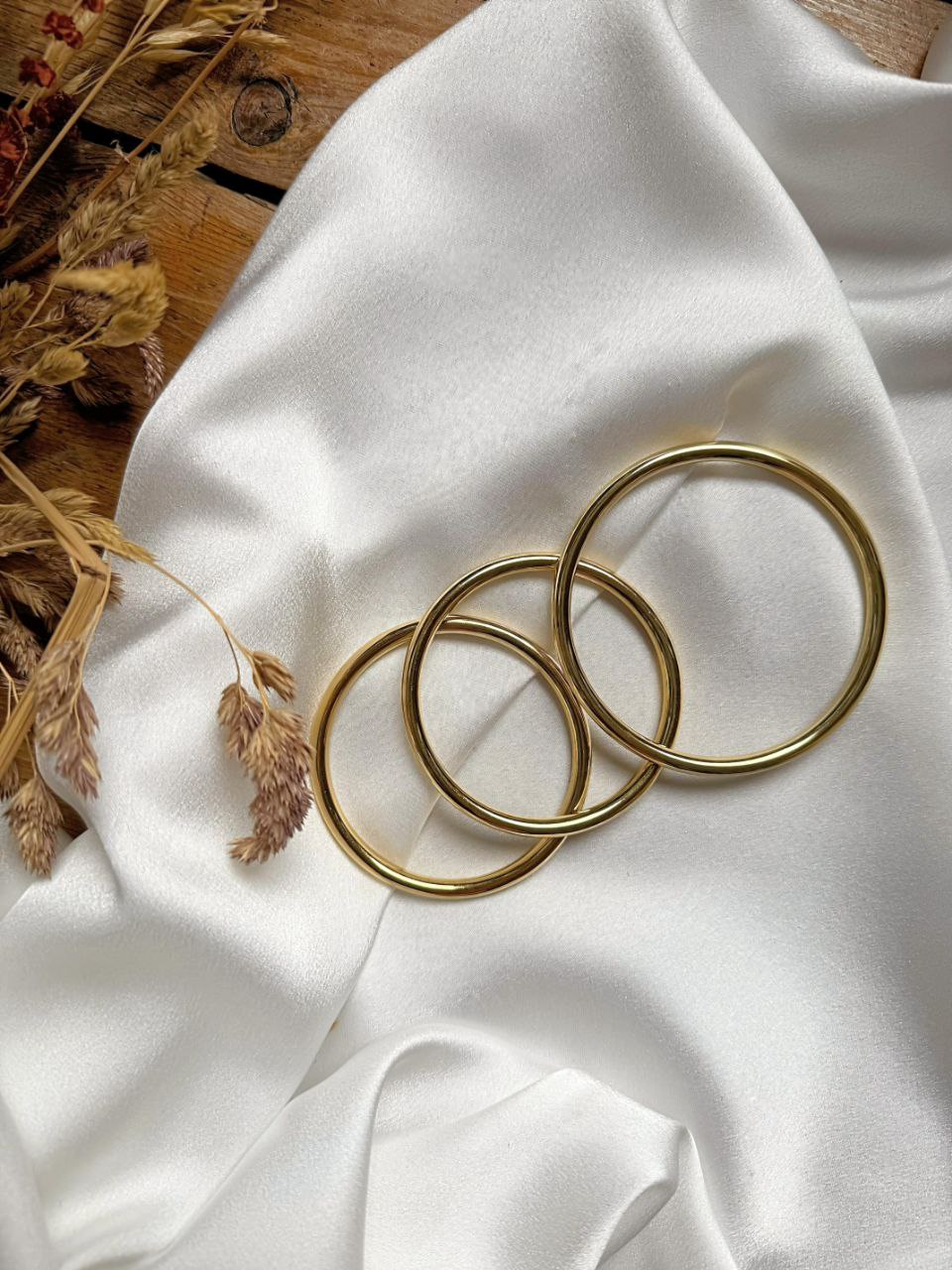 Les puristes du style minimaliste apprécieront également de les porter seuls, sans autre ajout. Dans cette configuration, le trio de joncs crée un équilibre visuel subtil qui affirme un goût pour les bijoux discrets mais assumés.